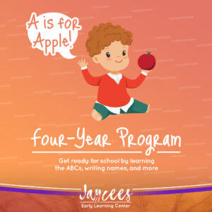 Jaycees Early Learning Center offers a four-year-old daycare program with custom curriculum, teachers, and classrooms which will support children with what they’ve already learned at our programs.